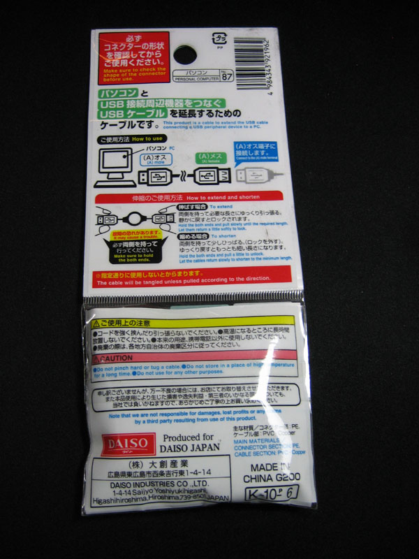 以前見つけた100円ショップのシルクで買ったリール式USB延長ケーブル同様、パッケージと中身を分析して比較してみます。