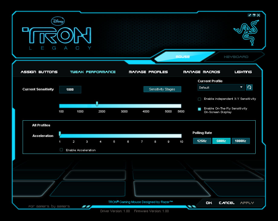 100~5600dpiまで100dpi単位で設定できますが、2000dpi~5600dpiは使いこなせそうにないです。「Enable independent X-Y Sensitivilty」のチェックボックスをオンにすると、X軸(横)Y軸(縦)それぞれ別なセンシを設定できます。