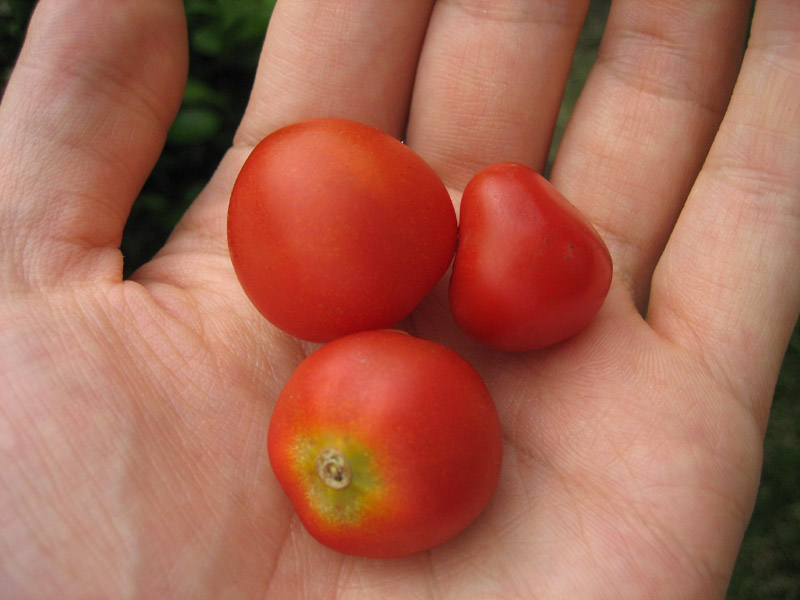 この品種は中玉トマトで、重さは40~50g位になるはずだったのですが、上の写真の通り、我が家で収穫できた実はミニトマトサイズでした。重さはキッチンスケールでの実測で、約9.0g、6.7g、4.5gです。軽いですね。