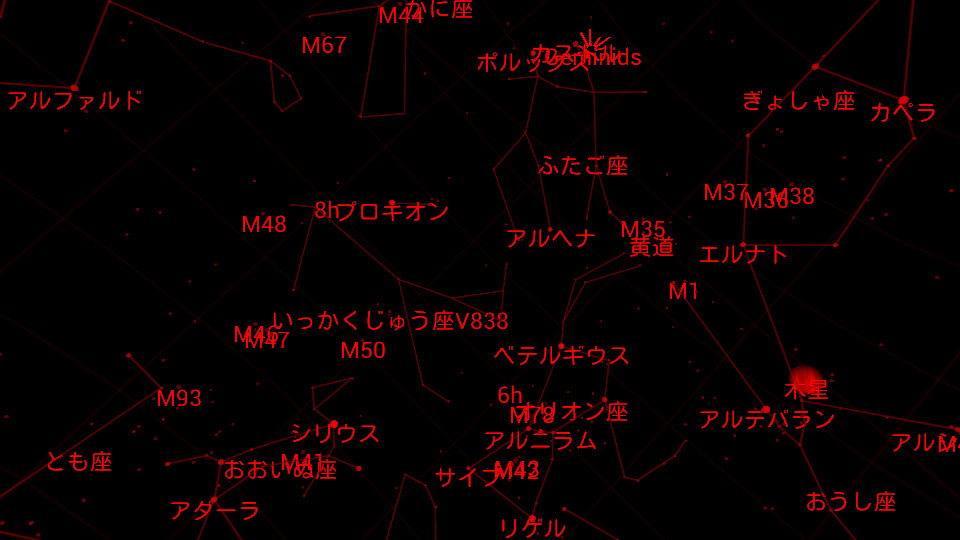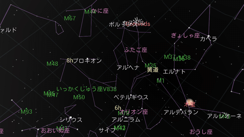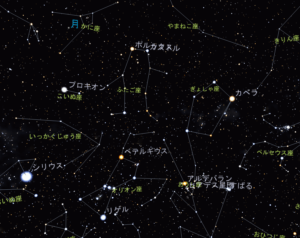 ふたご座の位置は、特徴的で分かりやすいオリオン座の上にあります。
