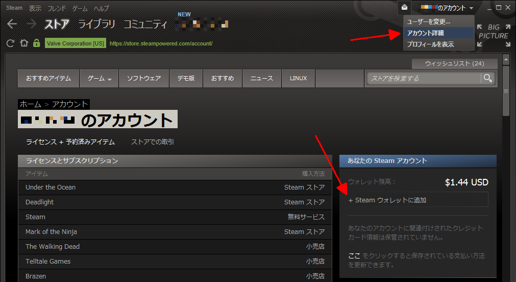 久しぶりにSteamウォレットへPayPal経由でドルをチャージしようと思った所、チャージのページの場所が分からずチャージに手間取ってしまったので、手順等をまとめて置きたいと思います。