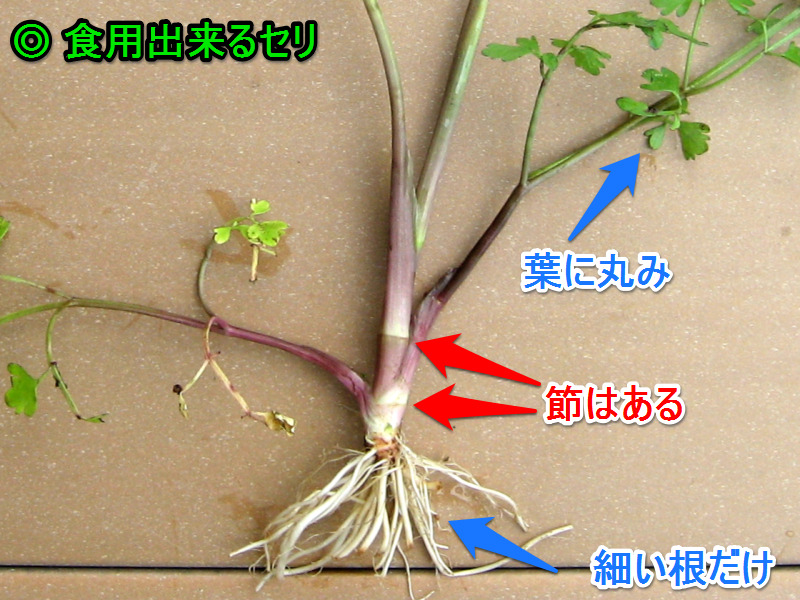 特に節の部分については、ドクゼリの特徴として知られている為、セリ取りに慣れていないと迷いそうです。