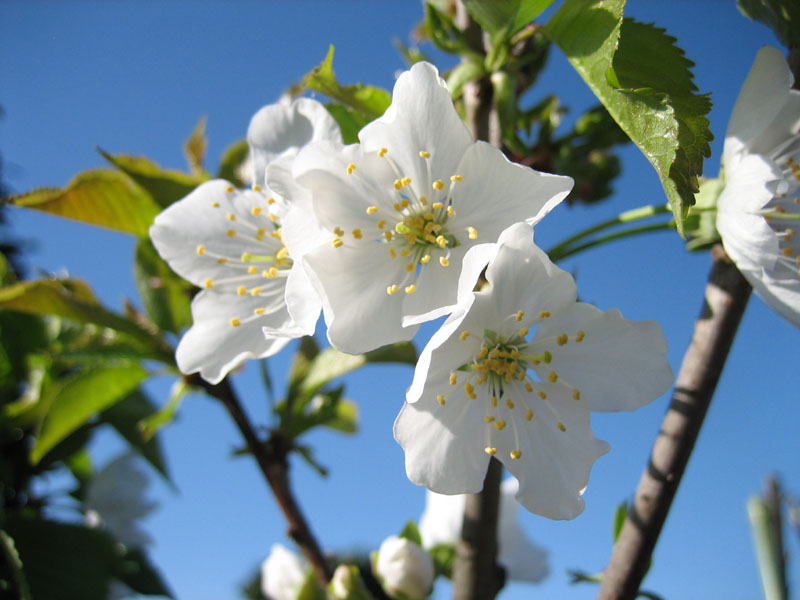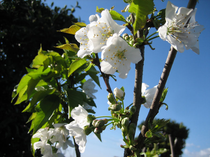 品種は、佐藤錦。鉢植えでの管理中です。白い花が雨上がりの青空に映えます。