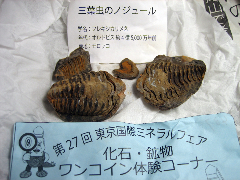 会場に戻って更に暫く石を見た後、自分で選んだ水晶と三葉虫のノジュールを、1個500円で割ってくれる体験コーナーが2Fにあったので、私は三葉虫、友人は水晶のノジュールを選んで体験してきました。