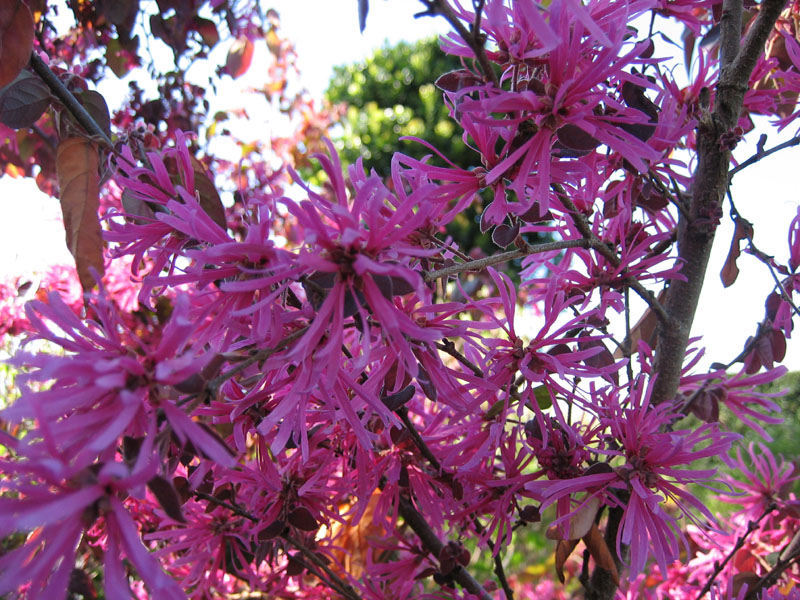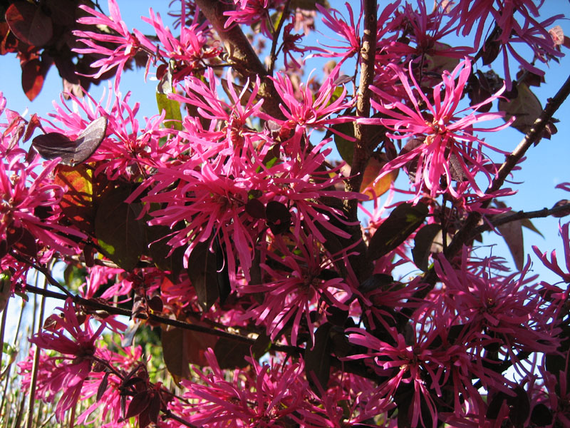 光の加減によって、ショッキングピンク、赤紫に色を変化させます。青空とのコントラストは目を惹きます。