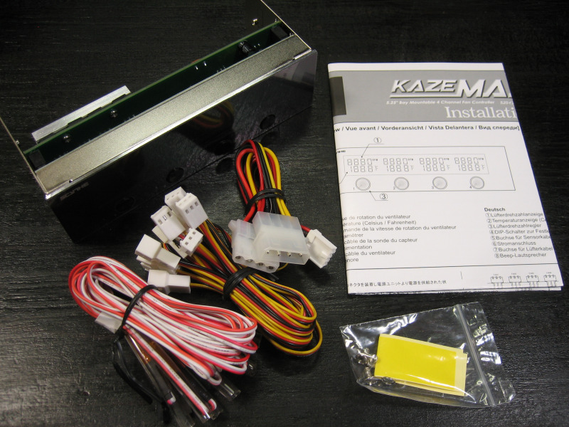 付属品は、取付けネジ、温度センサー用貼り付けシール、日本語マニュアル、ファンケーブル、温度センサーケーブル、電源ケーブルです。