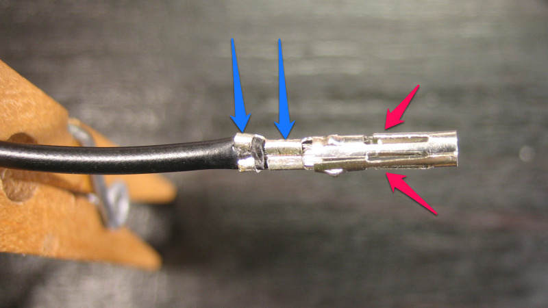 2つの加締め(青の矢印)をドライバーなどを挿し込む事で広げてGNDケーブルを挿し直し、ペンチで加締め直しました。