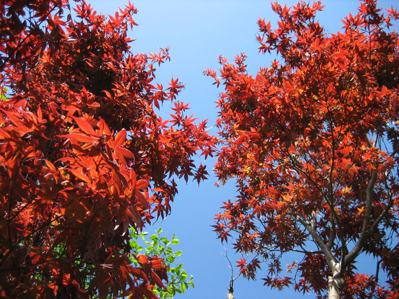 これは新芽が赤葉の種類のモミジで、紅葉とは逆の変化をみせます。秋になると赤味を帯びた緑色に変化していき、冬には他のモミジと同様に枯れて散っていきます。