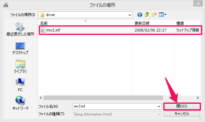 解凍したディレクトリ「UVNC_MD_SDK\driver\vista64\driver」の、「mv2.inf」を選択して【開く】をクリックします。