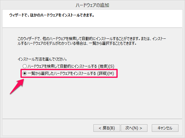 「一覧から選択したハードウェアをインストールする」を選択 して 【次へ】