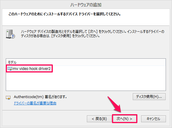 「mv video hook driver2」しか選択出来ないので、そのまま【次へ】をクリック。