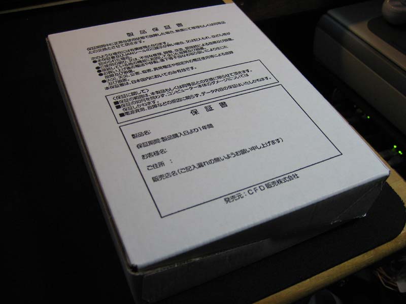 左、白箱入りで、代理店はCFD販売でした。箱には保証書が書かれており一年の保証期間とありますが、ソフマップの販売ページでは「■商品の保証は初期不良交換期間1ヶ月のみとなりますので、あらかじめご了承ください■メーカー保証はございません」と書かれているので、そちらが優先されます。