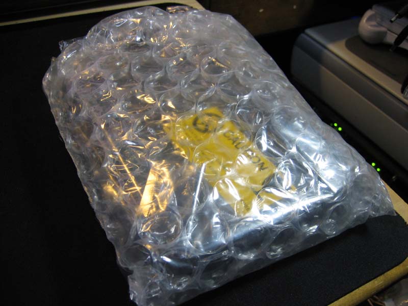 右、白箱を開けると更にプチプチの梱包が出てきます。プチプチを取ると静電気防止袋に包まれたHDDが入っています。
