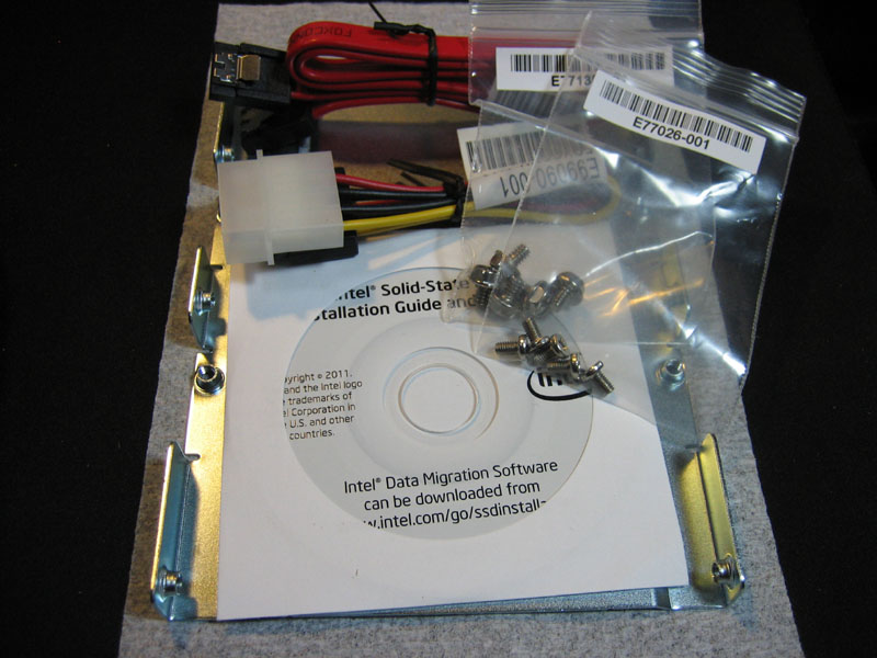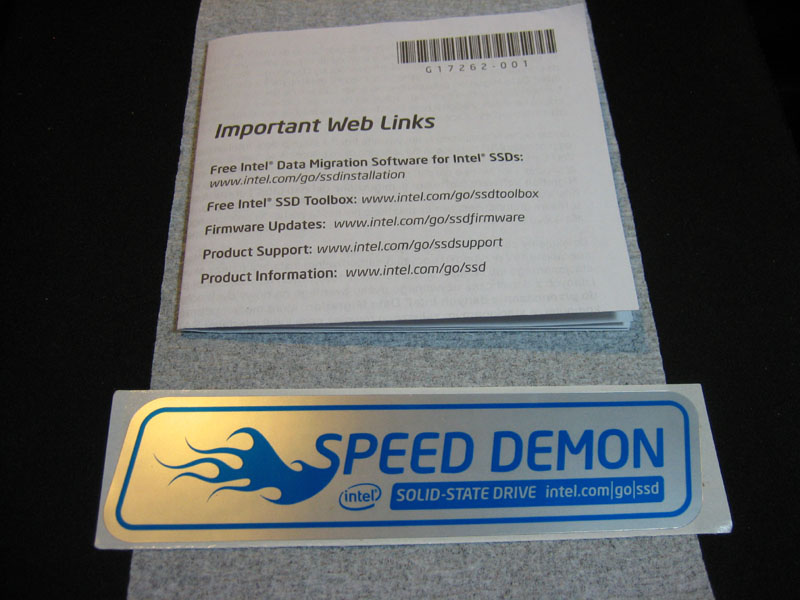 鉄製亜鉛めっきの3.5インチマウンタ、マウンタ用ネジ、ドライブ固定用ネジ、ラッチ付きSATAケーブル45cm、ラッチ付き4pin-SATA電源変換ケーブル、pdfが数個収まったCD、ツール・ファームウェアなどへのリンクが記された紙、SPEED DEMONと書かれたシールが入っていました。写真ではオレンジ色の電球の光が写りこんでいますが、シールはつや消しシルバー色です。