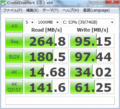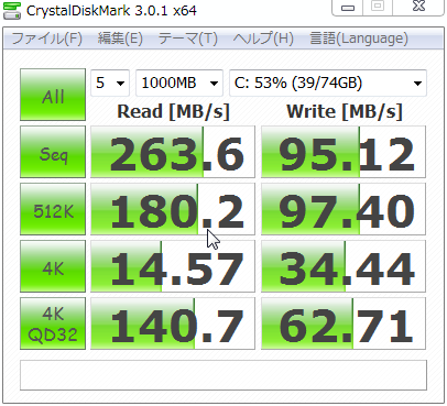 設定するのを忘れてカーソルが写りこんでしまいましたが気にしないでください。しかし、速いですね。データ保存用のドライブでは無いので、Seq(Seqencial:シーケンシャル)Read/Write性能は重視しませんが、システムドライブとして重視したいRandom4kRead/WriteはHDDと比べてかケタ違いに速いです。特に、4KQD32、つまり、NCQ有効時の結果は劇的に速くなっています。