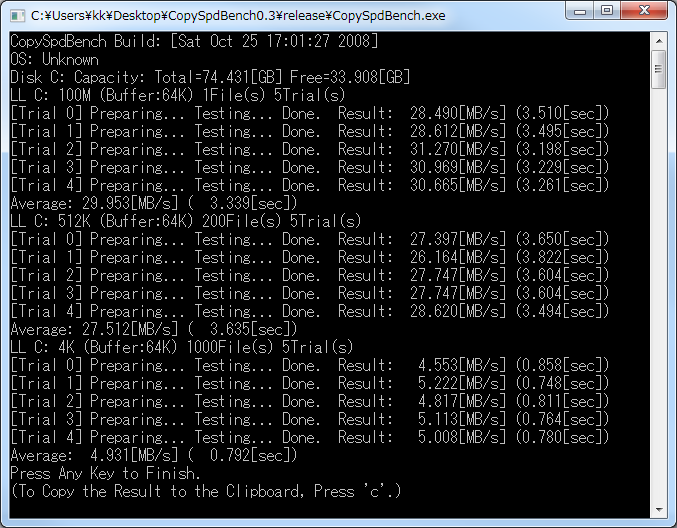 LL C: 512K (Buffer: 64K) 200File(s) 5Trial(s) : Average: 27.512[MB/s] ( 3.635[sec])