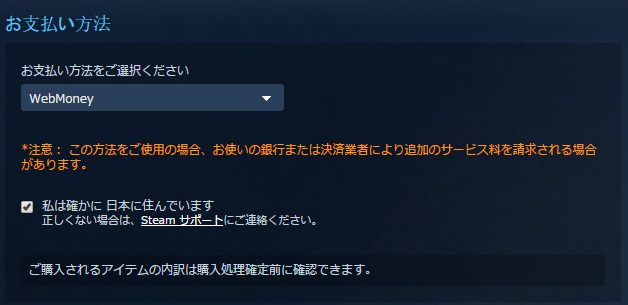 また、Steamウォレットコード経由でどうにかならないかと思いましたが、ウォレット(WebMoney含む)では購入出来ない事が分かり、Steamで使う事は諦めです。
