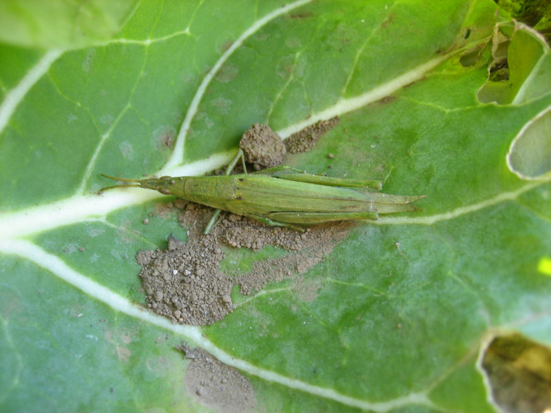 下の小さな隙間から入ってきたバッタによる多少の虫食い痕は見られましたが、モンシロチョウの幼虫による被害は無く、実験は概ね成功でした。