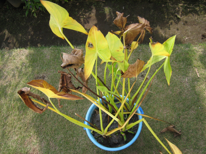 上の葉が枯れた後は水をあげず、雨よけができる所にバケツを置いて保管しました。