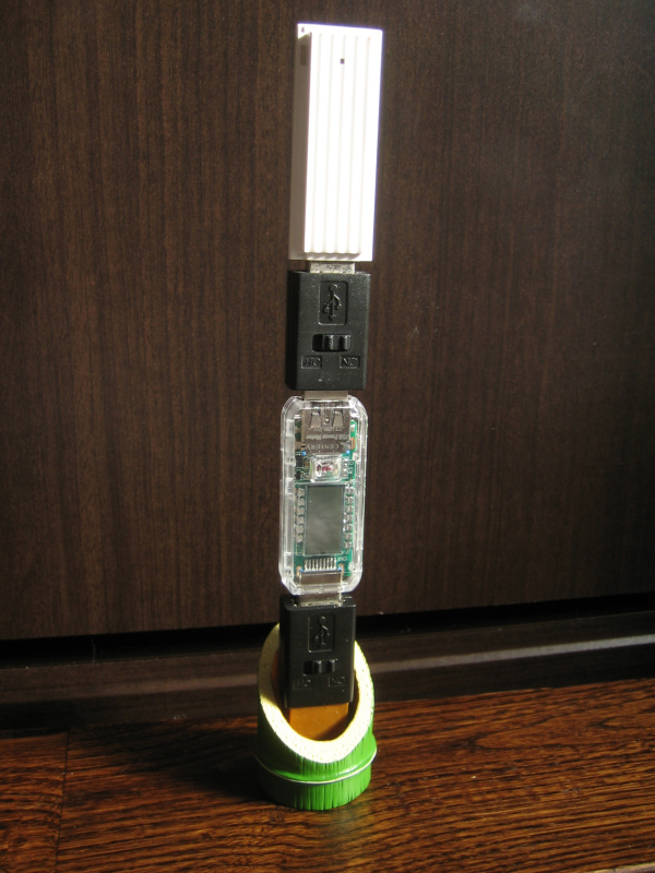 USBスイッチ→USBチェッカー→USBスイッチ→USBメモリと繋げてスタンドに挿してみましたが、普通に立ったので驚きです。