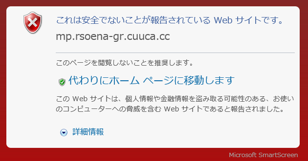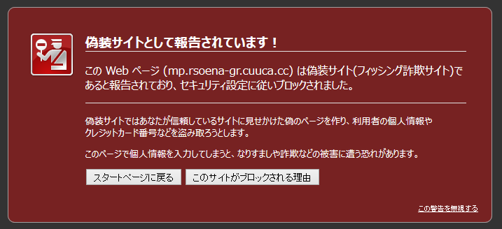 偽サイト発覚から時間が経過している事もあり、ブラウザ側で偽サイトはブロックされる様になっていました。