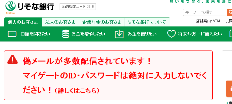 りそな銀行のサイトに行くと、目につく位置にデカデカと注意喚起が出ていました。