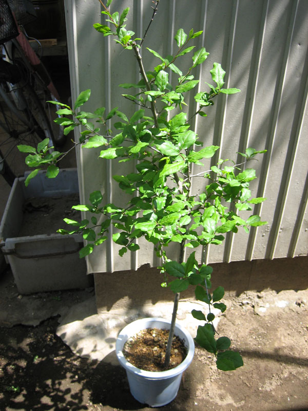 盆栽で使われる事の多い、観賞用の柿です。木の感じと葉っぱが綺麗で買ってしまいました。品種は不明です。→ 【楽天市場】老爺柿(ろうや柿) 都紅 2年生:SORA この販売苗と同じタグがついていたので、品種は都紅かもしれません。