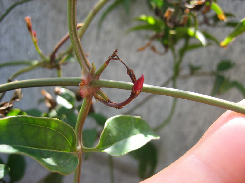 去年末にプランター植えから地植えに移植したハゴロモジャスミンですが、寒さで株が弱ってしまい、花芽をつけずにいました。あのいい香りの花は今年は拝めないのかとがっかりしていましたが、今日確認したところ、花芽を発見。(写真の真中の赤いもの)、ただ、あまりにも少しだけの花芽なので香りは期待できそうにないです。
