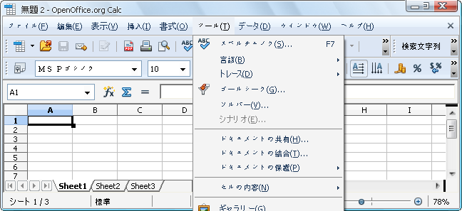 フォントサイズの変更は、ツールメニューの「ツール」から→「オプション」を開き、「OpenOffice.org」→「表示」の設定を開きます。