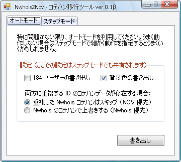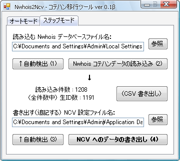 ステップモードにすると、自分で移行設定を選択する事ができます。また、コテハン情報をCSV形式で書き出しできます。自動検出で検出できるボタンがあるので、「外部からコテハンデータを読み込みたい」という場合以外は実際のところ半自動で移行できます。ボタンに書かれている(1)、(2)、(3)、(4)の順に従っていくと完了です。