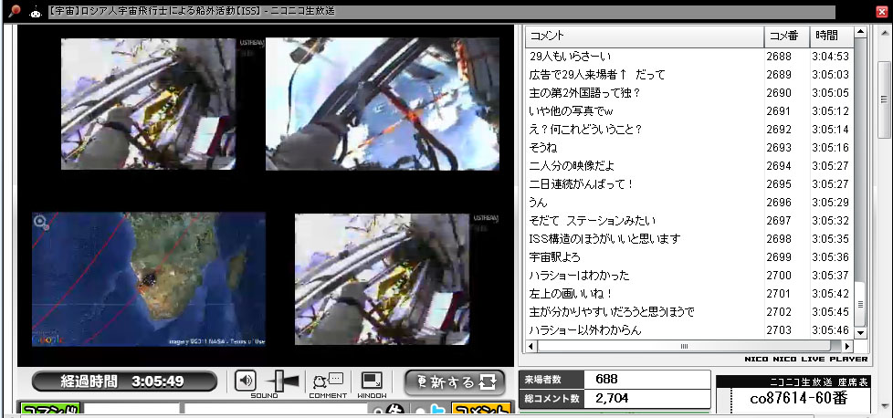 今回のミッションは、おそらく、日本人宇宙飛行士が居ないことや、華のあるロケット発射等では無いことから、ロケット発射放送の半分程度の累計来場者数:13094人 コメント数:62234と、長時間放送な割に注目度が低かったです。