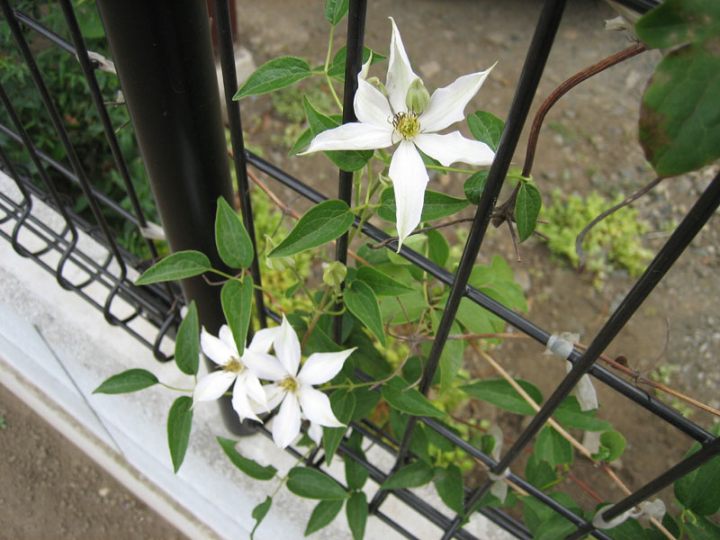 こちら別なフェンスです。庭植えにした後、一度枯れたマクロペタラが復活して花を咲かせました。