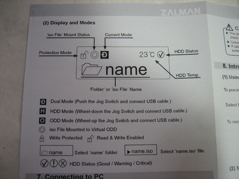 ISOイメージが何も入ってない状態で接続すると、NO-ISOと出ます。液晶の上の青いランプはアクセスランプです。輝度はそれなりで眩しいということはないです。(カメラの設定を調節しましたがLEDは上手く撮れませんね・・・。)対応HDDでは温度が表示されますが、古いモデルのHDDなので温度は表示されませんでした。