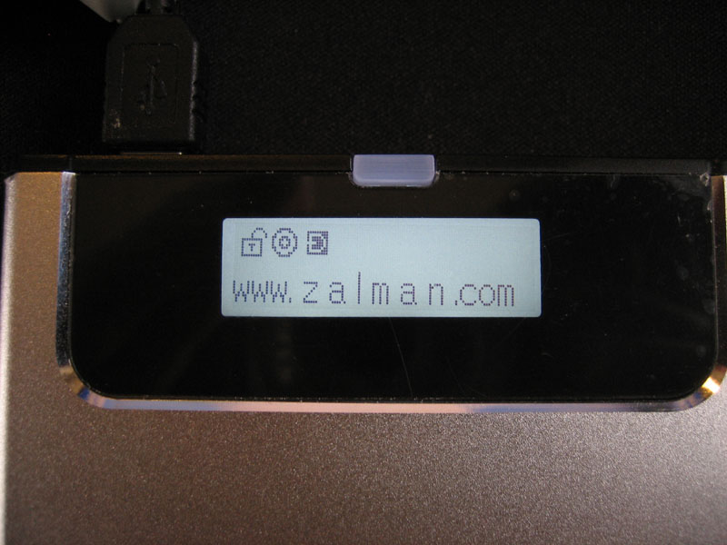 USBを接続して起動すると、まずZALMANのURLが表示されます。液晶はバックライト付きで視認性は問題ありませんでした。