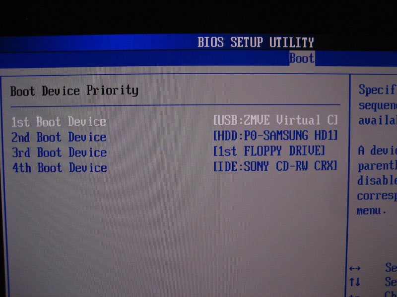 BootDeviceでZM-VE200を一番上にして、再起動すると普通にOSの読み込みが始まりました。
