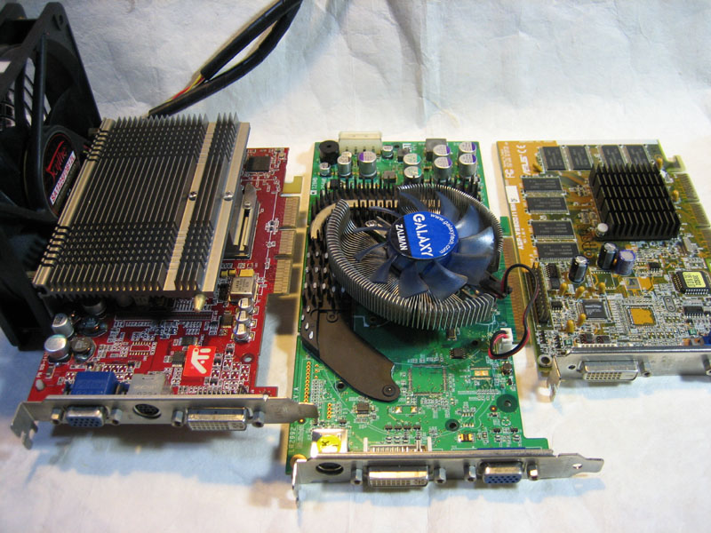 左からRADEON 9700pro、GeForce A6800XT、RIVA TNT2 16MBです。