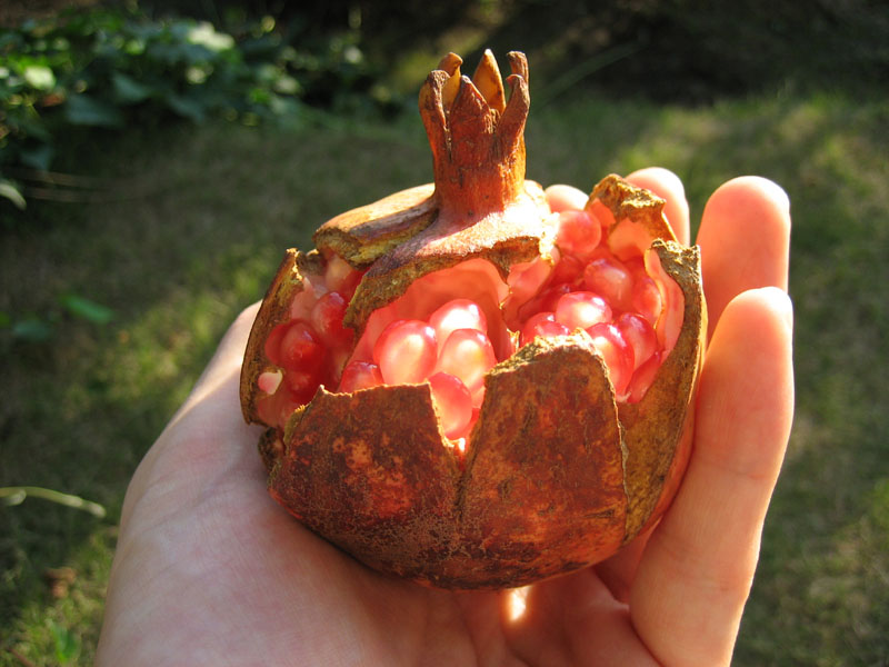 スーパーで見かけるようなイランやトルコ産の真っ赤なザクロと比べると赤みが薄く、酸っぱいですが、昔ながらの日本のザクロいった感じで好きです。