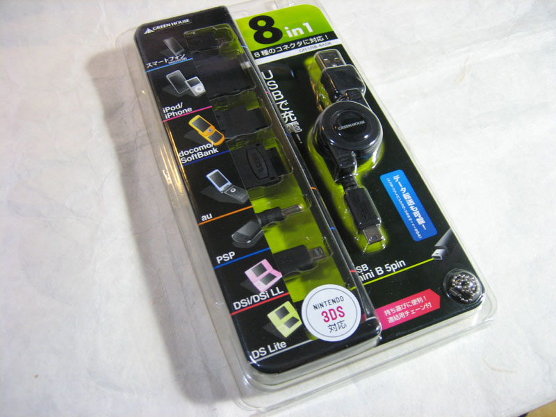 買ったのはGREEN HOUSE(グリーンハウス)のUSB充電ケーブルセット、GH-USB-8ADKで、8つの端子で色々なモバイル機器を充電することができます。この手の充電端子は何種類か持っていますが、接続できる端子が所有しているものよりも多かったので購入しました。値段は980円で、色は白と黒があります。