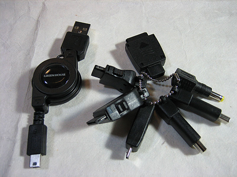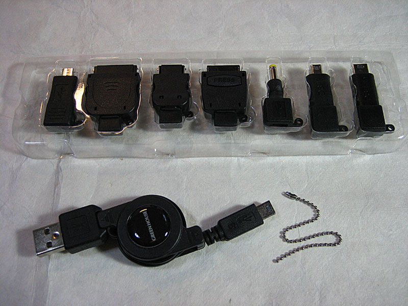 左の写真:付属品は変換端子7個と、リール式miniUSB端子、ボールチェーンです。