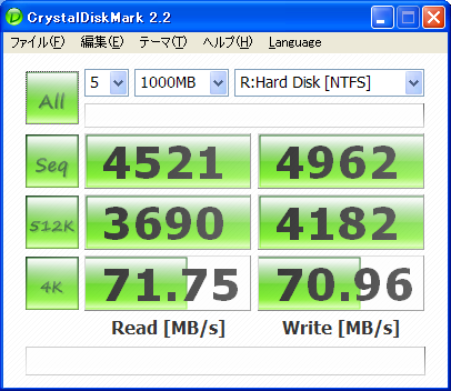 フォーマットはNTFS、ベンチマークはCrystalDiskMark2.2、データは1000MB、5回に設定し、平均を取ります。