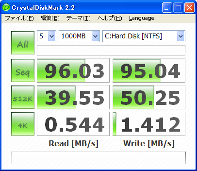 参考 HDD WesternDigital WD10EADS 1TB AHCI NQC対応、Cドライブ、クリーンインストール直後では無い状態でのベンチマークです。