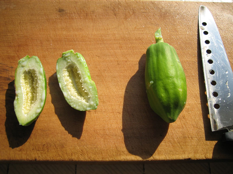 実を収穫した時から白い液が出始めていたのですが、半分に切ると更に沢山の白い液が出てきました。パパイアっぽい良いニオイもします。白い液は空気に触れるとゼリー状に固まるのですが、手に触れたままにしておくと痛くなったり、痒くなったりするそうです。この液はタンパク質分解酵素(パパイン)を含むという話なので、皮膚のタンパク質を溶かしてしまうのでしょうね。