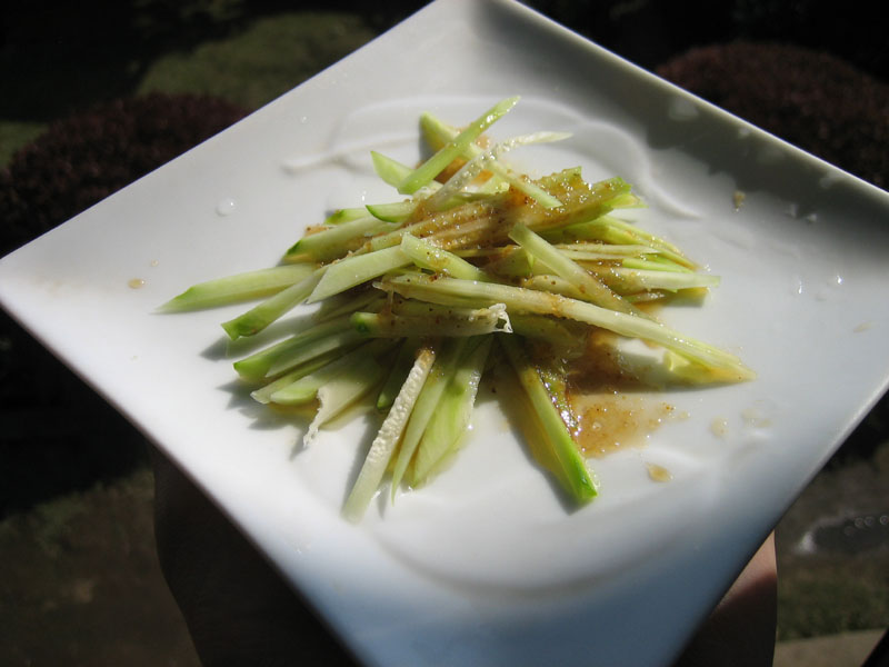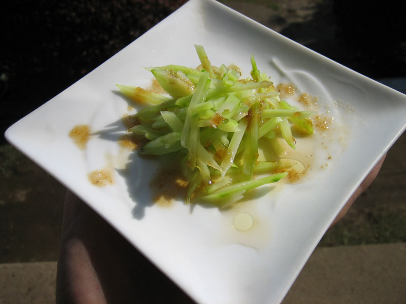 もっと細かい千切りにしたかったのですが、実が小さく、包丁では無理でした。アクが出るようなので半日水にさらしておいてから盛りつけて、オリーブオイルと柚子胡椒ドレッシングをかけていただいたのですが・・・エグ味が残っていて食べるのがきついorz どうにかならないものかと考えた結果、試しにマヨネーズもかけたらエグ味がかなり薄らぎ、食べることができました。また、繊維質な独特の歯ごたえがあるのですが、例えるのが難しいです。あえて例えるならば、少し硬めのカブでしょうか。変わった食感です。