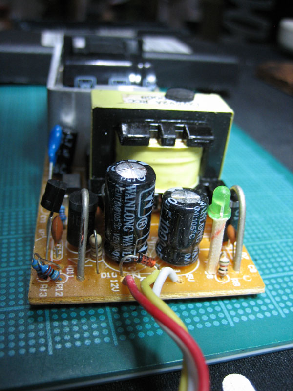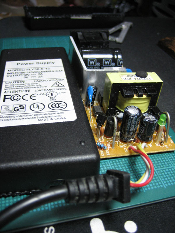このACアダプタが使われていたのはUSB外付けのHDDケースで、買ったのはたしか・・2004年頃。安物のケースでした。そして2年くらいでLEDが点滅するようになって出力が安定せず、壊れてしまいました。原因はコンデンサだろうと予測はついたのですが、修理が面倒で放置状態でした。