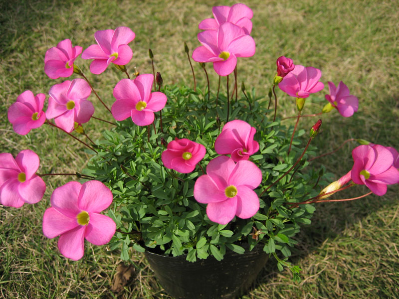 まずは、オキザリス、カタバミ科の球根類で、花色がピンクの品種です。一日で何度もパラソル状の花が咲いたり閉じたりします。花持ちは良いようで、夕方には花が蕾状に閉じました。