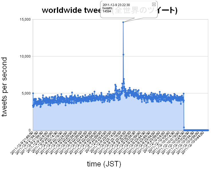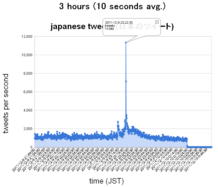 次に、Twitterでは、バルス時に日本語によるつぶやき(ツイート)が、11,349TPS(tweets per second、一秒あたりのツイート数、※10秒間サンプリング平均による算出)を記録、世界全体では14,594TPSに達しました。