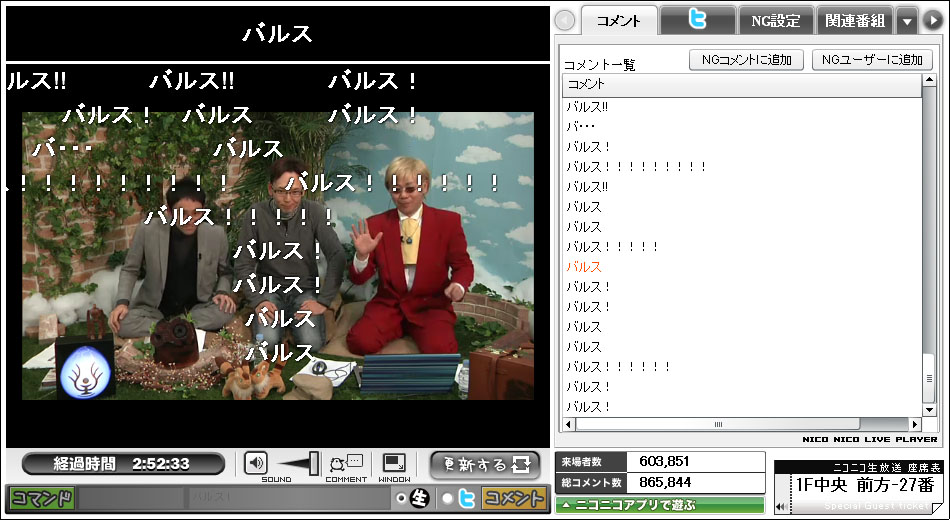 コメント鯖は落ちる事なく番組最後まで持ち応えました。が、実際の所コメント鯖は重く、コメントが反映されるまで時間がかかり視聴者が満足にコメント出来ないという自体になり、規制があったのでは?とまで言われる始末でした。