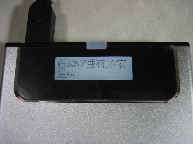 右の写真:顔文字も表示させてみました。表示させたのは「a(´・ω・`)(ヾノ・∀・`)ナイナイ(^-^)」です。こちらも全角記号部分が全滅でした。あと、半角カタカナが表示出来ないのが判りました。
