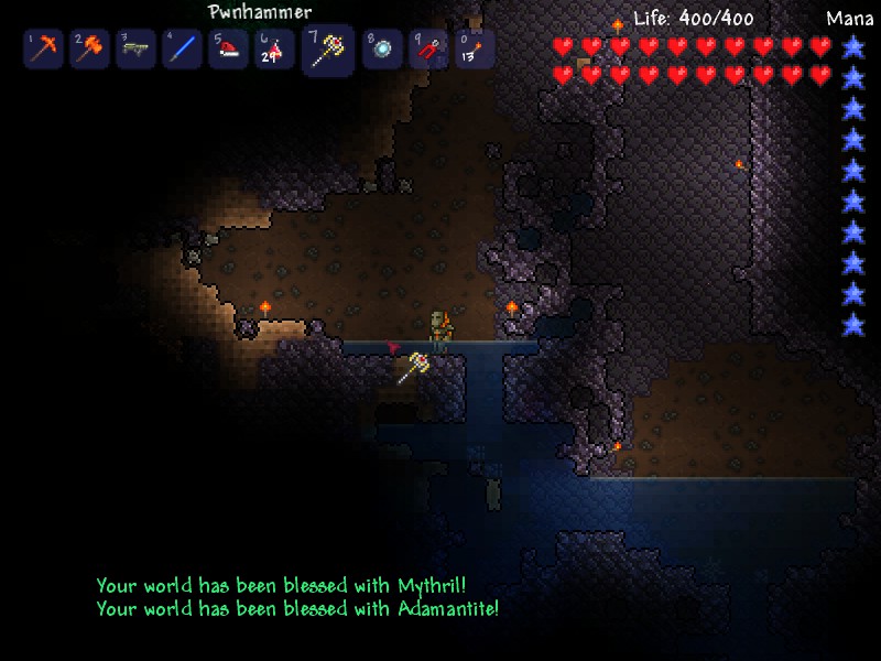 Wall of Fleshを倒して手に入るPwnhammerを使うと、Demon Altarを壊すことが出来るようになります。Demon Altarはイソギンチャクみたいな奴です。壊すと、1つにつき1つの鉱石がワールドに出現します。出現するのはコバルト、ミスリル、アダマンタイトの順番です。