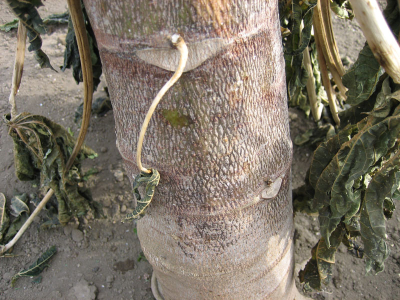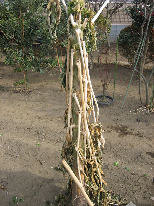 中心の太い幹は一見無事のように見えますが、触ってみると、夏の時の硬い幹と比べて若干ブヨブヨしていて、寒さのダメージを受けていることが判ります。幹の皮を擦ると、ベロンと剥がれおちました。